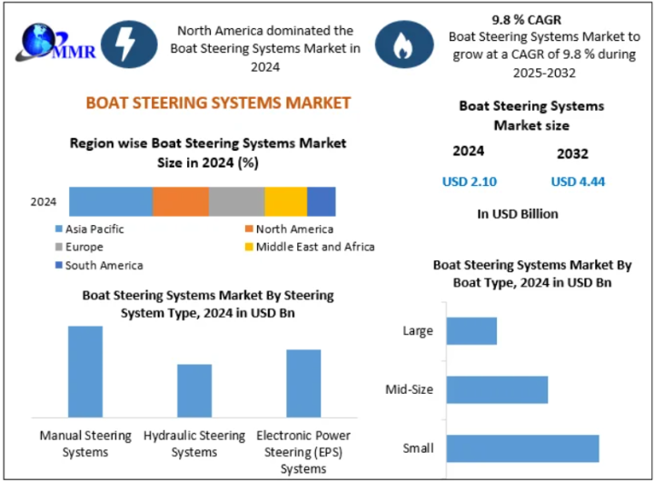 The Global Boat Steering Systems Market was valued at USD 2.10 billion in 2024 and is projected to reach USD 4.44 billion by 2032, growing at a CAGR of 9.8% from 2025 to 2032. Boat steering systems, which include gear assemblies, telemotors, control units, and power units, are essential for maneuvering vessels efficiently and safely from port to starboard. With advancements in green shipbuilding technology, increasing government investments in naval fleets, and growing adoption of electronic power steering systems, the demand for innovative and reliable boat steering solutions is expanding globally.
