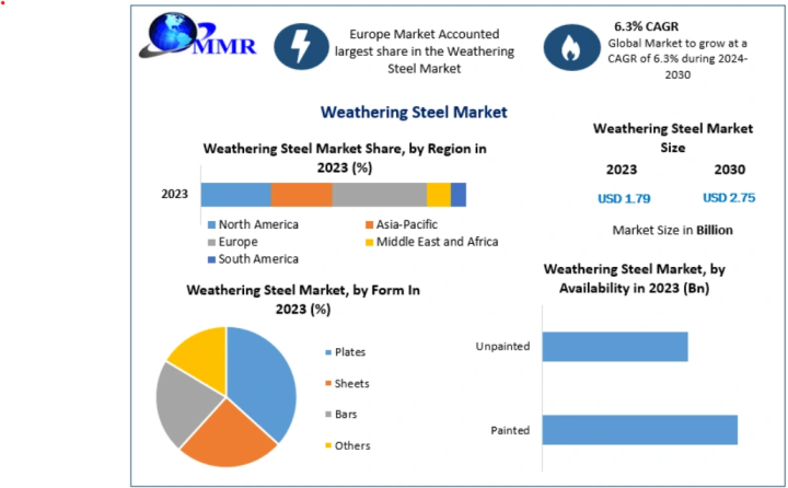 The Global Weathering Steel Market was valued at USD 1.79 billion in 2023 and is projected to reach approximately USD 2.75 billion by 2030, growing at a CAGR of 6.3% from 2024 to 2030. Weathering steel, also known as COR-TEN steel, is a high-strength alloy renowned for its durability, corrosion resistance, fatigue strength, and temperature tolerance. Its long service life, low maintenance requirements, and aesthetically appealing rusted finish make it ideal for a wide range of applications, including bridges, roads, railway structures, poles, and architectural projects.