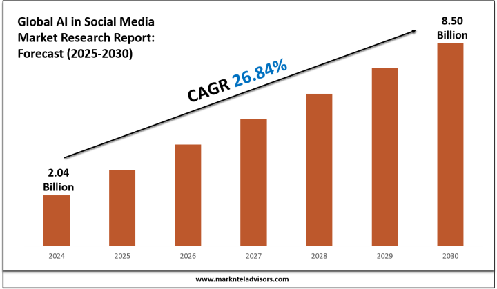 The Global AI in Social Media Market size was valued at around USD 2.04 billion in 2024 and is projected to reach USD 8.50 billion by 2030. Along with this, the market is estimated to grow at a CAGR of around 26.84% during the forecast period, i.e., 2025-30.