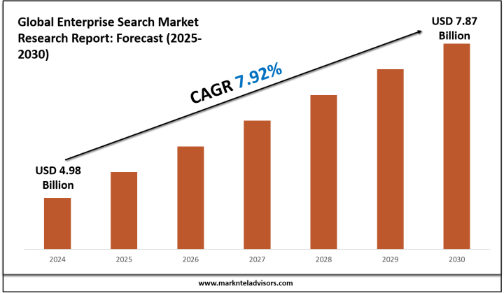 The Global Enterprise Search Market size was valued at USD 4.98 billion in 2024 and is expected to reach USD 7.87 billion by 2030. Along with this, the market is estimated to grow at a CAGR of around 7.92% during the forecast period, i.e., 2025-30.