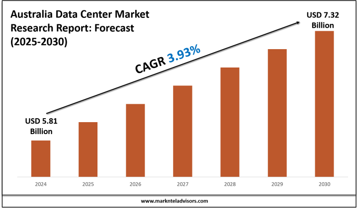 The Australia Data Center Market size was valued at around USD 5.81 billion in 2024 and is projected to reach USD 7.32 billion by 2030. Along with this, the market is estimated to grow at a CAGR of around 3.93% during the forecast period, i.e., 2025-30. Key factors driving this growth include escalating cloud migration, increasing cybersecurity threats, compliance demands, and the necessity for real-time monitoring and support.