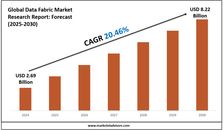 The Global Data Fabric Market size was valued at around USD 2.69 billion in 2024 and is expected to reach USD 8.22 billion by 2030. Along with this, the market is estimated to grow at a CAGR of around 20.46% during the forecast period, i.e., 2025-30.